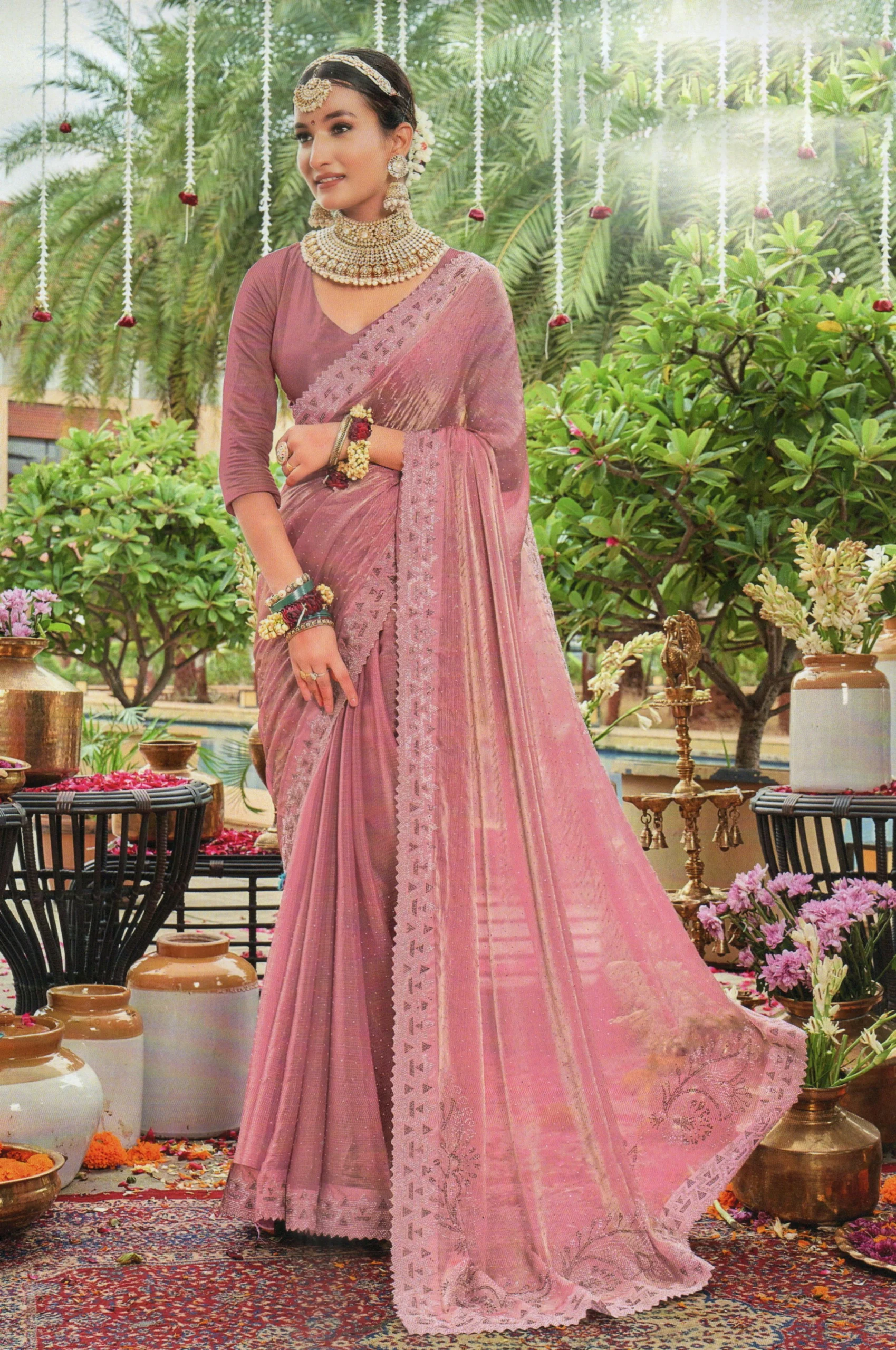 Jimmy Choo-Inspired Designer Silk Saree – Soft Pink with Golden Embroidery