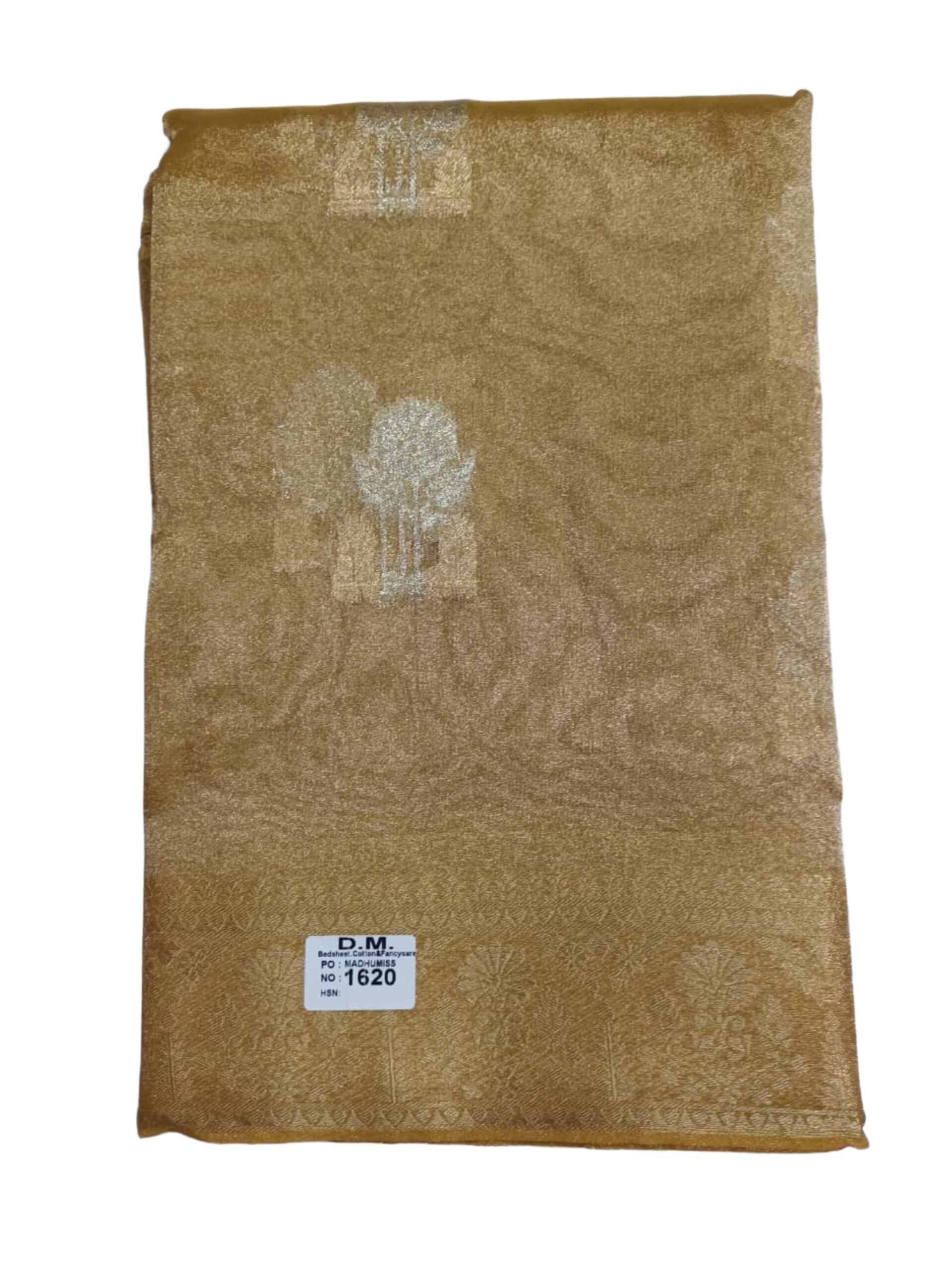 Step into understated opulence with this Premium Silk Tissue Saree from Rajeswari Boutiques, a radiant blend of tradition and modern sophistication. The saree features a soft golden hue with a gentle sheen that catches the light beautifully, creating a luminous silhouette.