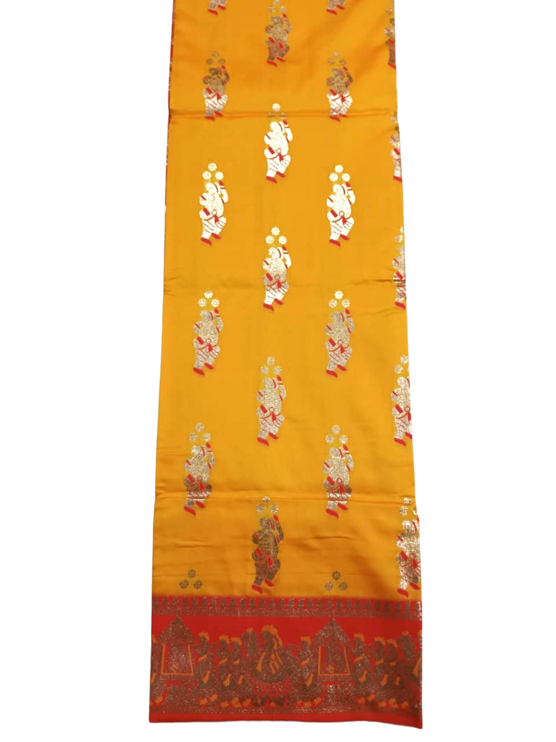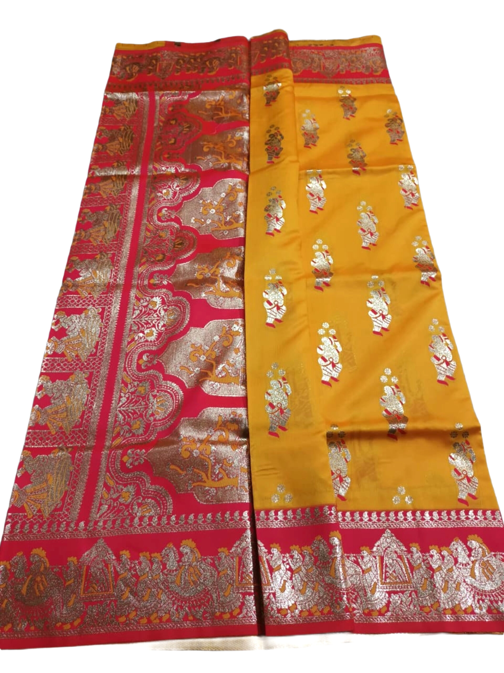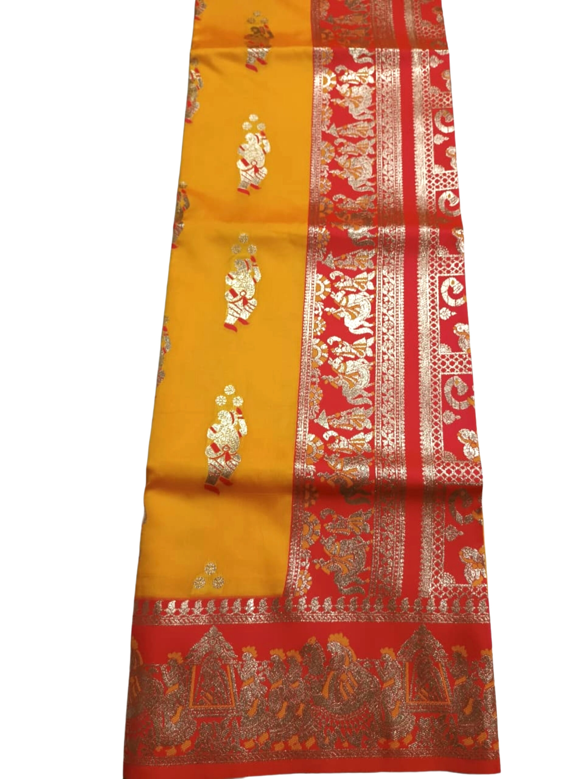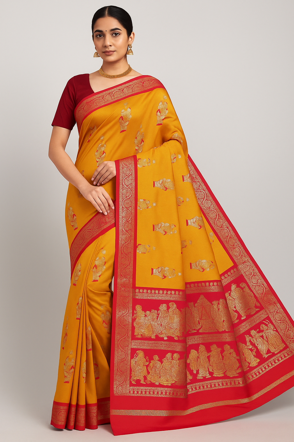 Pure Baluchari Silk Saree – Mustard Yellow with Red Border