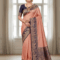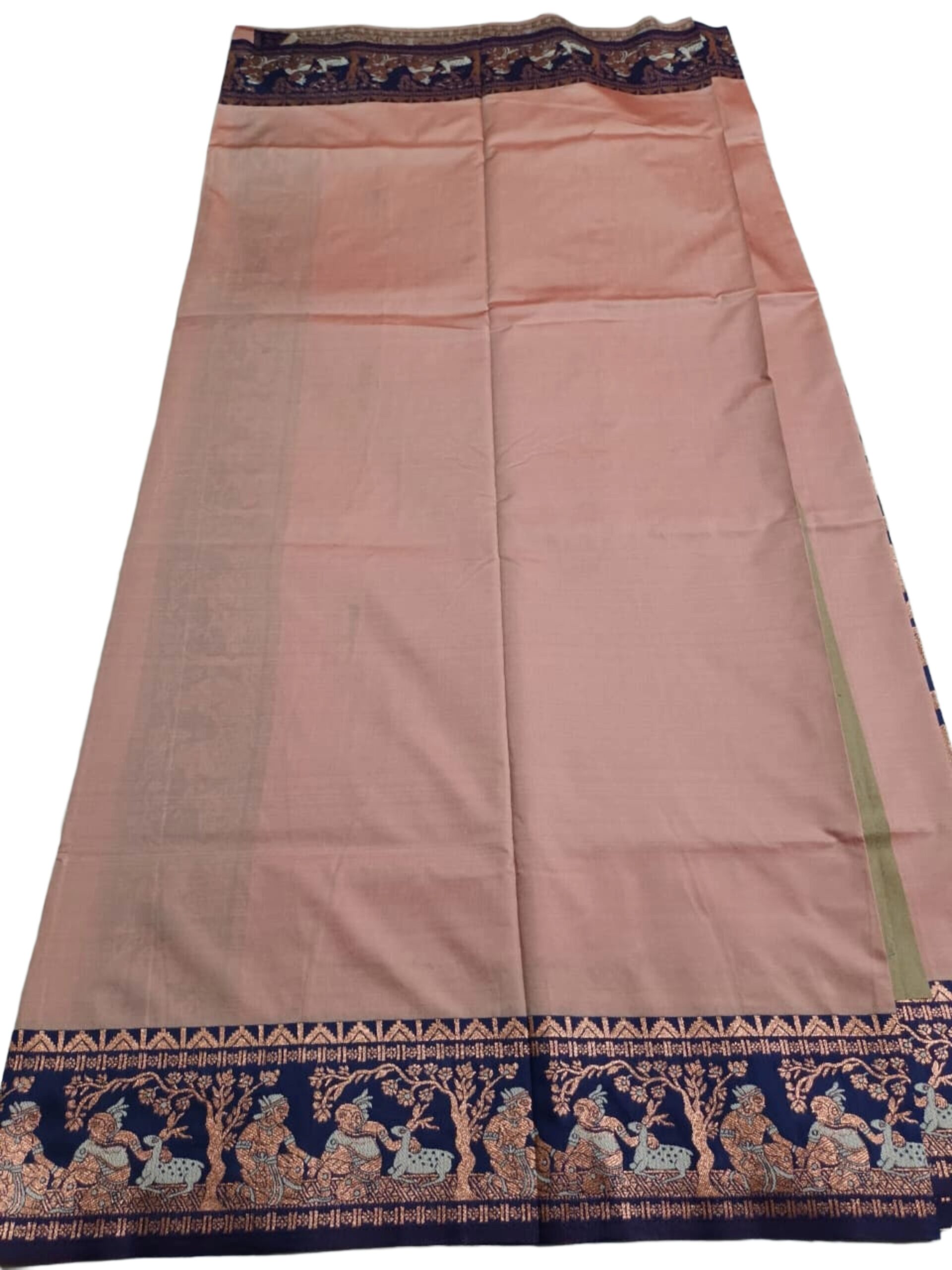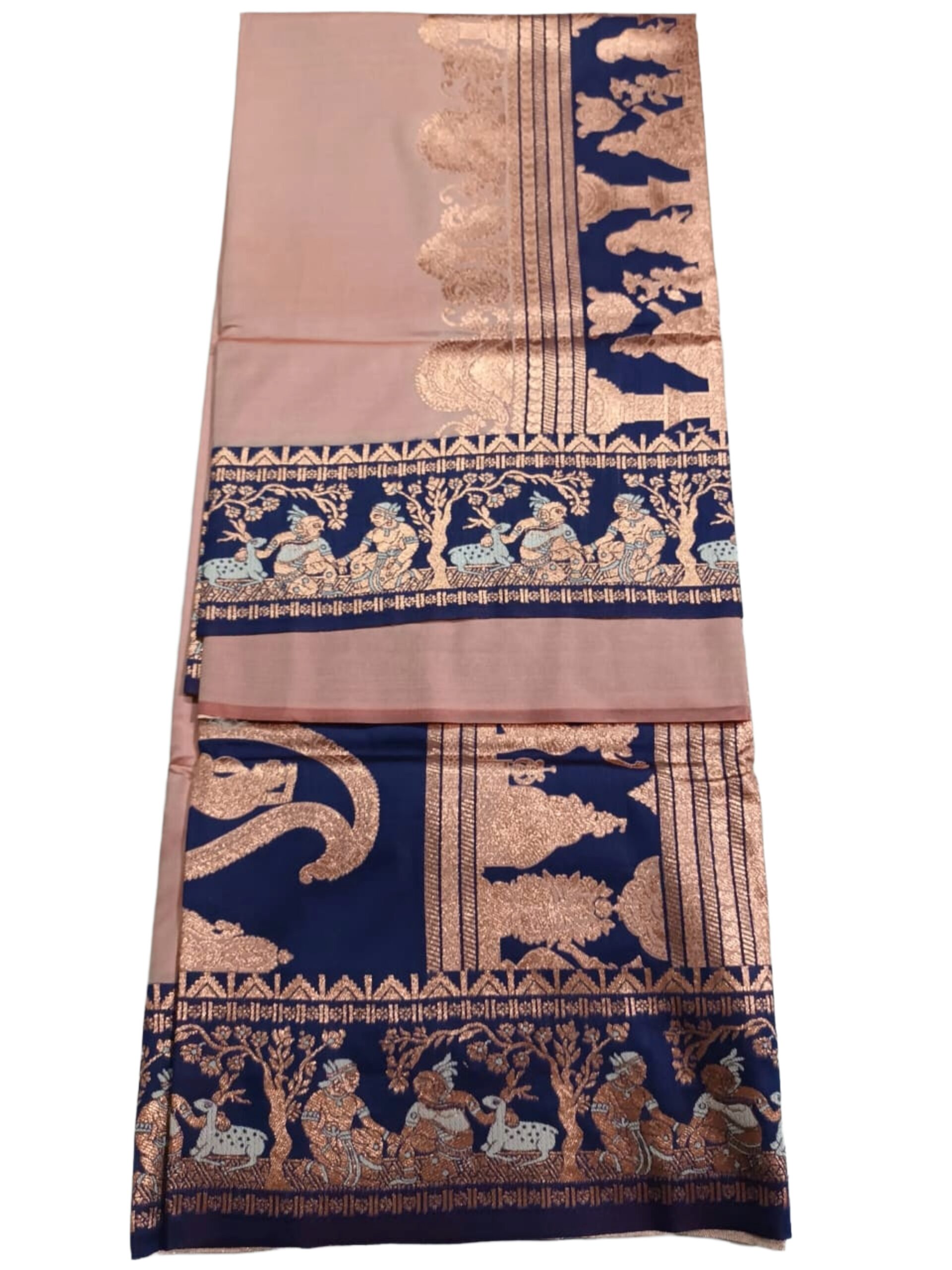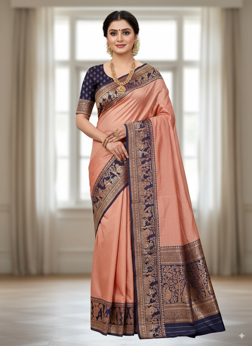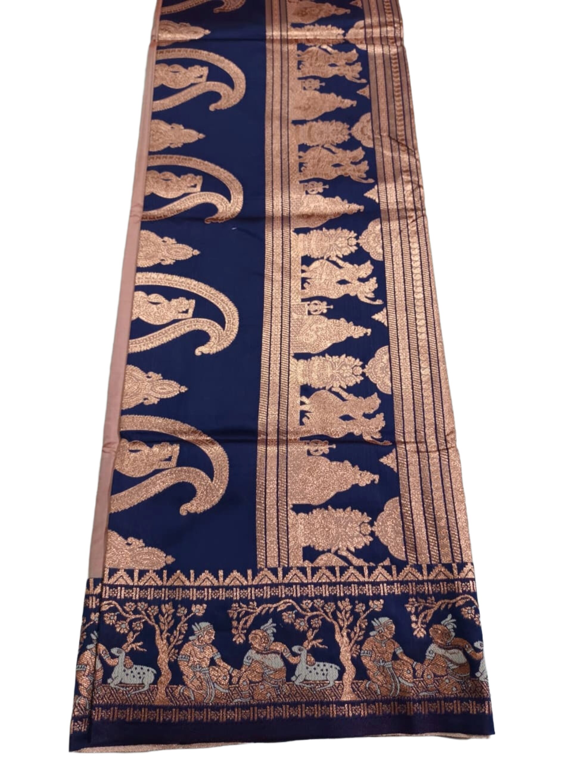 Pure Baluchari Silk Saree – Peach with Navy Blue Border