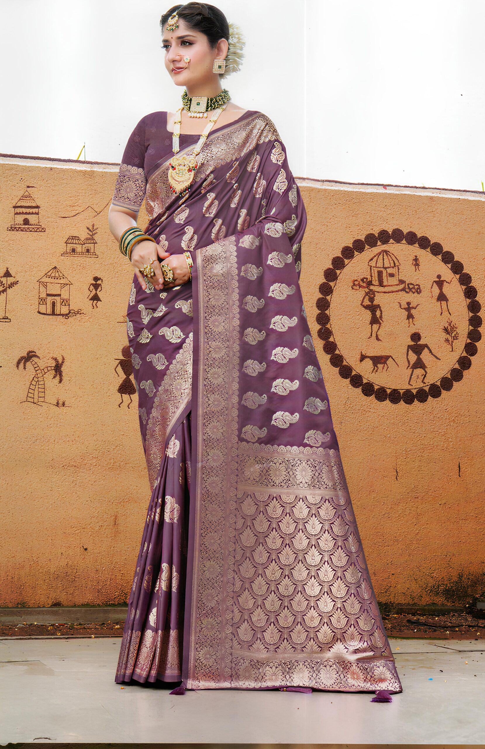 Women’s Banarasi Silk Jaal Katan Zari Work Dual Tone Saree With Blouse Piece – Purple | Rajeswari Boutiques